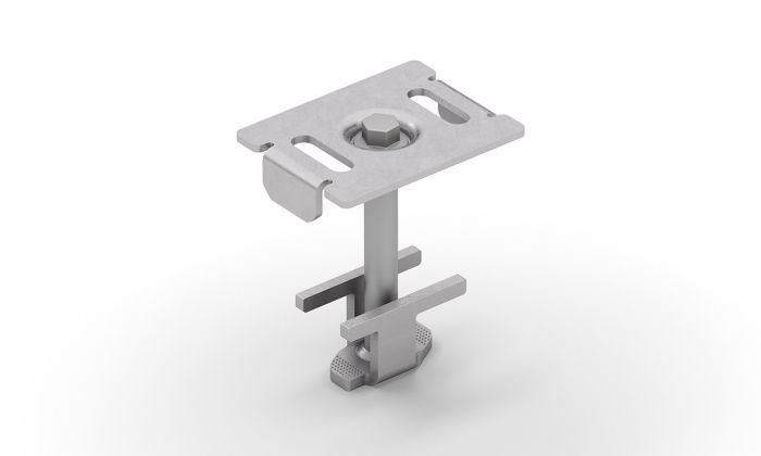 Weland mittklämma används mellan två paneler. Klämman trycks ner i infästningsskenan och vrids för att haka fast. Vid panelbyte kan klämman enkelt skruvas loss och monteras tillbaka. Utformad för nordiska förhållanden med höga snölaster och stark klimatpåverkan.